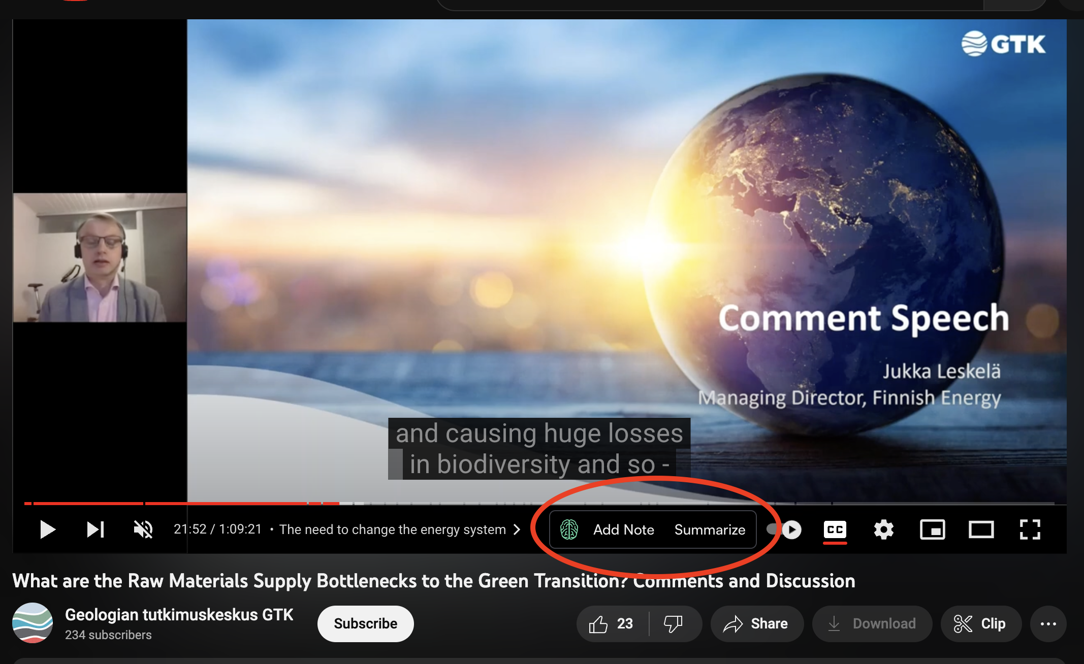 New "Add Note" and "Summarise" buttons in Youtube